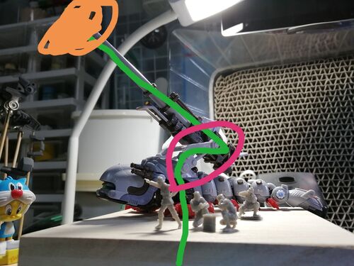 次はコトブキヤさんのHMMシリーズから、キャノリーモルガです。 今回はジオラマ仕立てにしたいと思います。 イメージはこんな感じです。 砲塔の先にLEDを仕込んで、砲撃の瞬間を表現したいと思います。 緑の線は、配線の案です。 キャノリーユニットの接続部…